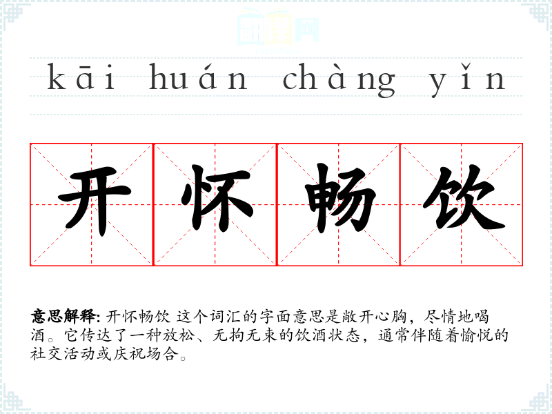 开怀畅饮 这个词汇的字面意思是敞开心胸,尽情地喝酒。它传达了一种放松、无拘无束的饮酒状态,通常伴随着愉悦的社交活动或庆祝场合。