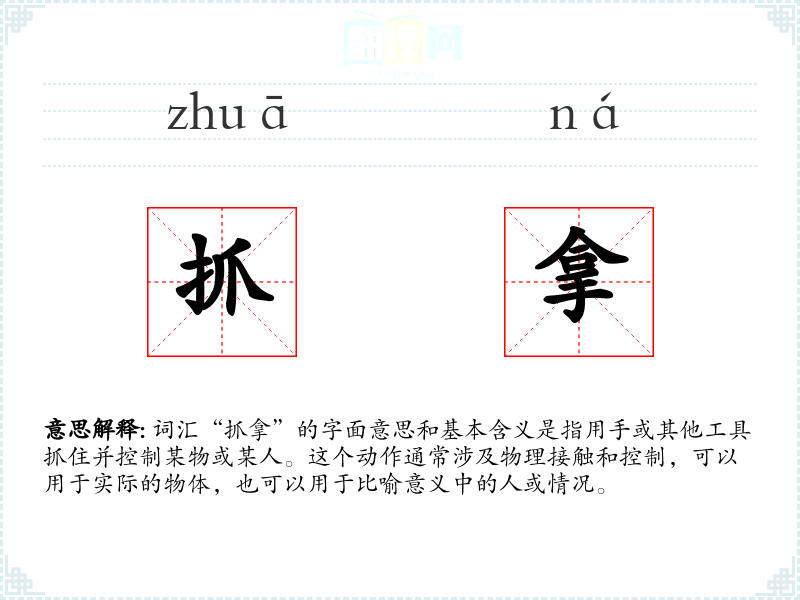 词汇“抓拿”的字面意思和基本含义是指用手或其他工具抓住并控制某物或某人。这个动作通常涉及物理接触和控制,可以用于实际的物体,也可以用于比喻意义中的人或情况。