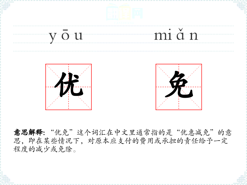 “优免”这个词汇由“优”和“免”两个字组成,其中“优”指的是优越、优惠,而“免”则指的是免除、不需支付。这个词汇在古代文献中较少见,更多是在现代汉语中,随着经济活动和社会政策的复杂化而逐渐普及。