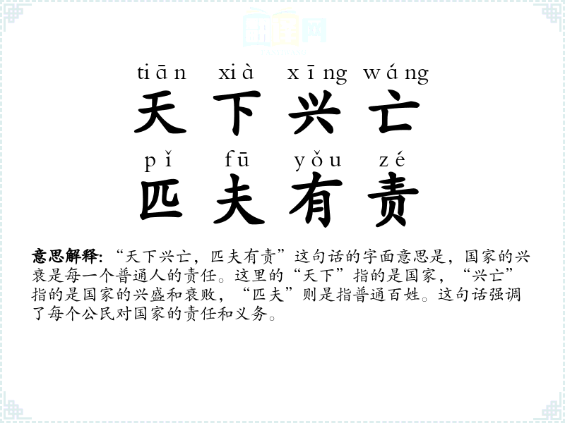 - 同义词:国家兴亡,人人有责;天下大事,匹夫有份。