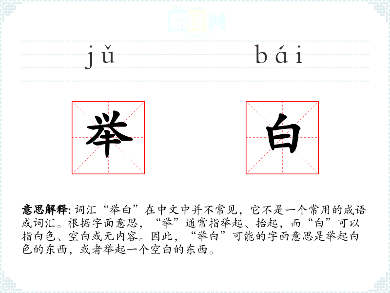词汇“举白”在中文中并不常见,它不是一个常用的成语或词汇。根据字面意思,“举”通常指举起、抬起,而“白”可以指白色、空白或无内容。因此,“举白”可能的字面意思是举起白色的东西,或者举起一个空白的东西。