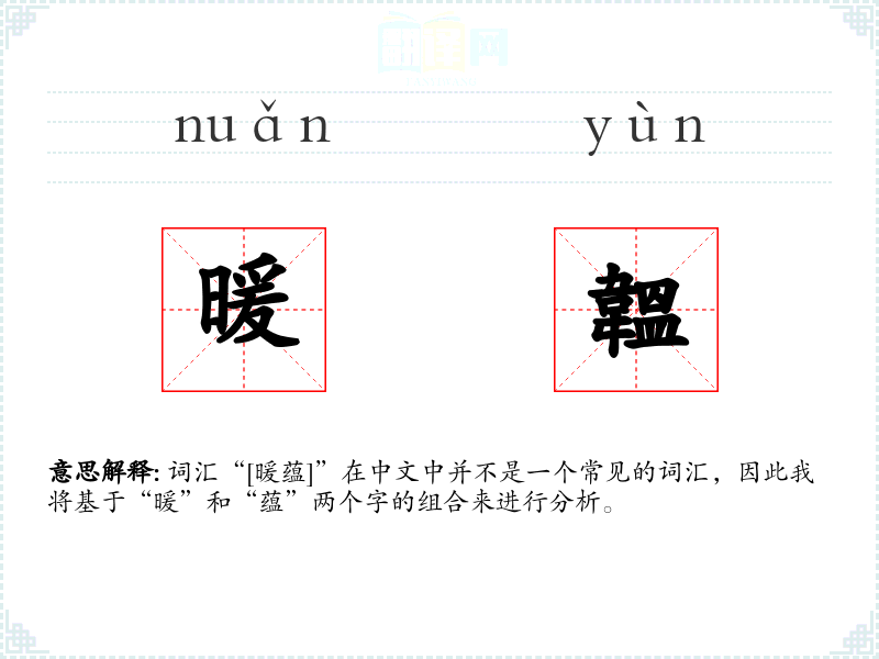 词汇“[暖蕴]”在中文中并不是一个常见的词汇,因此我将基于“暖”和“蕴”两个字的组合来进行分析。