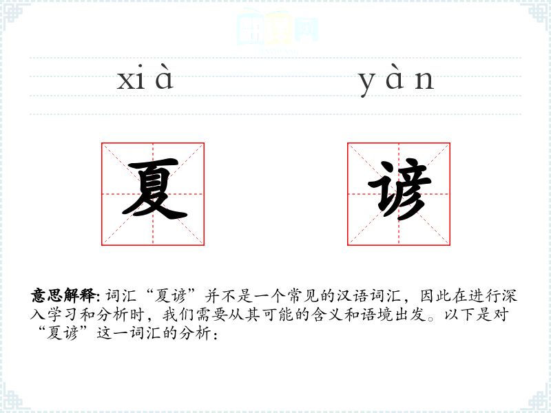 词汇“夏谚”并不是一个常见的汉语词汇,因此在进行深入学*和分析时,我们需要从其可能的含义和语境出发。以下是对“夏谚”这一词汇的分析: