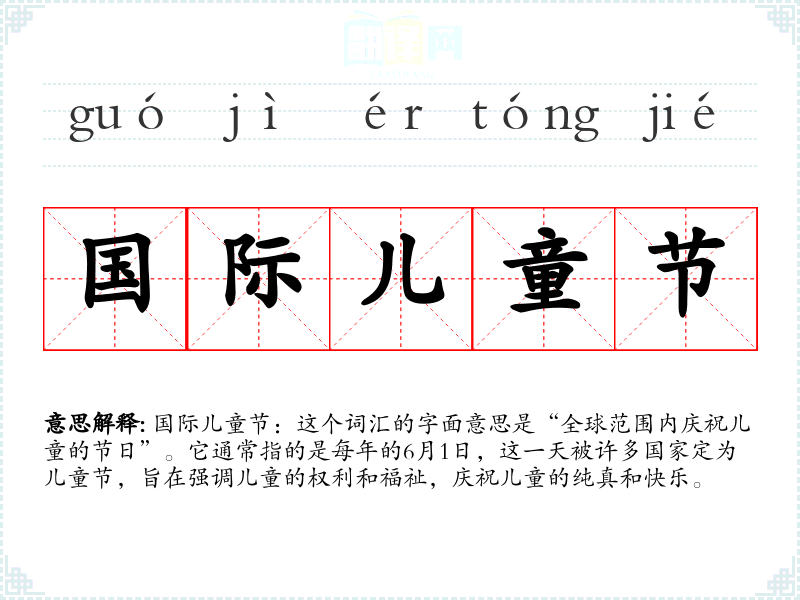 国际儿童节:这个词汇的字面意思是“全球范围内庆祝儿童的节日”。它通常指的是每年的*月1日,这一天被许多国家定为儿童节,旨在强调儿童的权利和福祉,庆祝儿童的纯真和快乐。