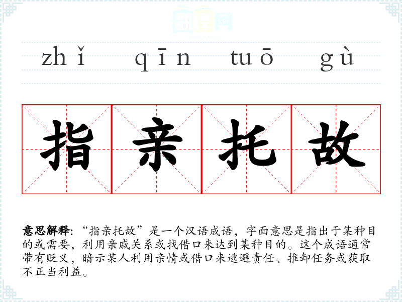 “指亲托故”是一个汉语成语,字面意思是指出于某种目的或需要,利用亲戚关系或找借口来达到某种目的。这个成语通常带有贬义,暗示某人利用亲情或借口来逃避责任、推卸任务或获取不正当利益。