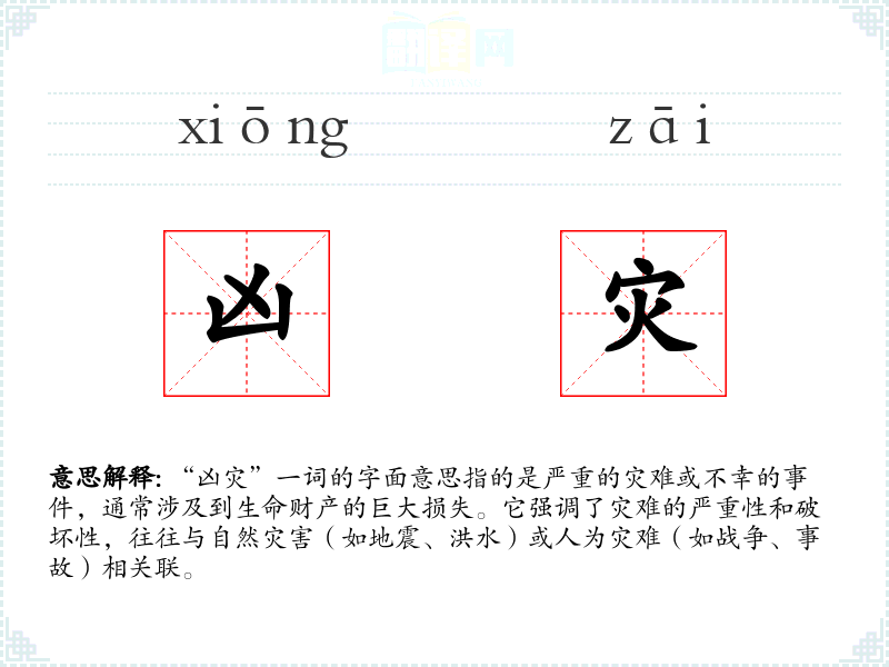 “凶灾”一词的字面意思指的是严重的灾难或不幸的**,通常涉及到生命财产的巨大损失。它强调了灾难的严重性和破坏性,往往与自然灾害(如地震、洪水)或人为灾难(如战争、事故)相关联。