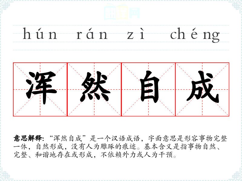 “浑然自成”是一个汉语成语,字面意思是形容事物完整一体,自然形成,没有人为雕琢的痕迹。基本含义是指事物自然、完整、和谐地存在或形成,不依赖外力或人为干预。