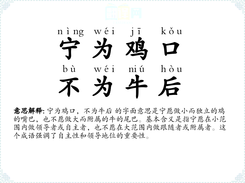 ※ "宁为鸡口,不为牛后"的意思解释、宁为鸡口,不为牛后是什么意思由翻译网汉语词典查词提供。