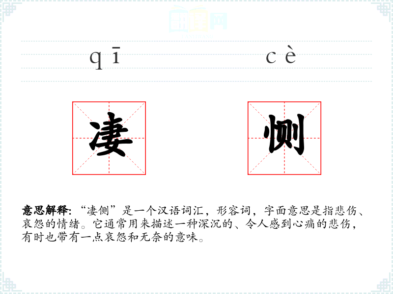 “凄侧”是一个汉语词汇,形容词,字面意思是指悲伤、哀怨的情绪。它通常用来描述一种深沉的、令人感到心痛的悲伤,有时也带有一点哀怨和无奈的意味。