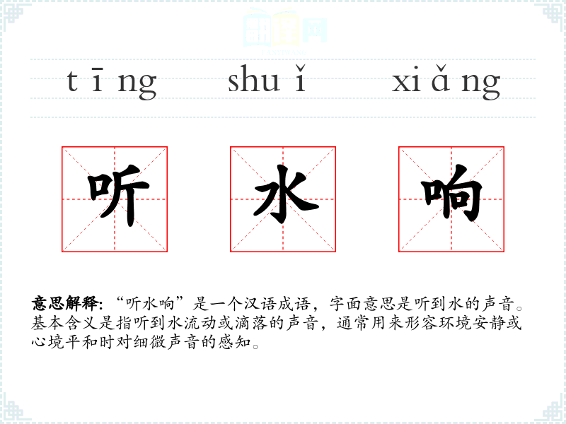 “听水响”是一个汉语成语,字面意思是听到水的声音。基本含义是指听到水流动或滴落的声音,通常用来形容环境安静或心境平和时对细微声音的感知。