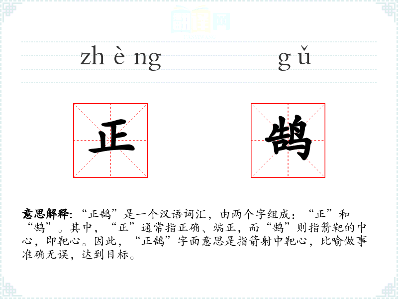 “正鹄”是一个汉语词汇,由两个字组成:“正”和“鹄”。其中,“正”通常指正确、端正,而“鹄”则指箭靶的中心,即靶心。因此,“正鹄”字面意思是指箭射中靶心,比喻做事准确无误,达到目标。
