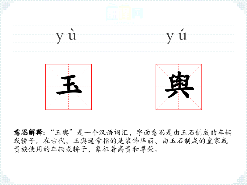 “玉舆”是一个汉语词汇,字面意思是由玉石制成的车辆或轿子。在古代,玉舆通常指的是装饰华丽、由玉石制成的皇家或贵族使用的车辆或轿子,象征着高贵和尊荣。
