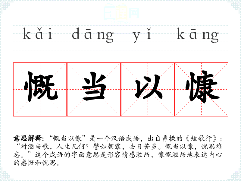 “慨当以慷”是一个汉语成语,出自曹操的《短歌行》:“对酒当歌,人生几何?譬如朝露,去日苦多。慨当以慷,忧思难忘。”这个成语的字面意思是形容情感激昂,慷慨激昂地表达内心的感慨和忧思。
