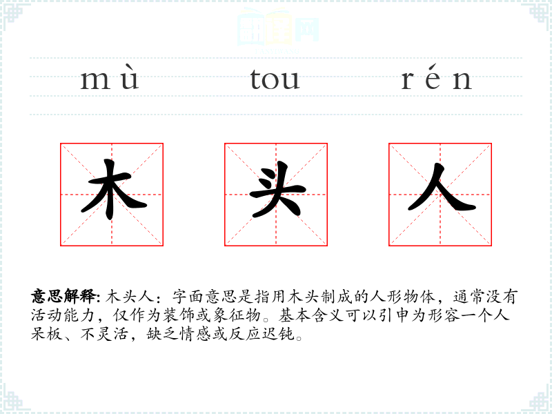 木头人:字面意思是指用木头制成的人形物体,通常没有活动能力,仅作为装饰或象征物。基本含义可以引申为形容一个人呆板、不灵活,缺乏情感或反应迟钝。