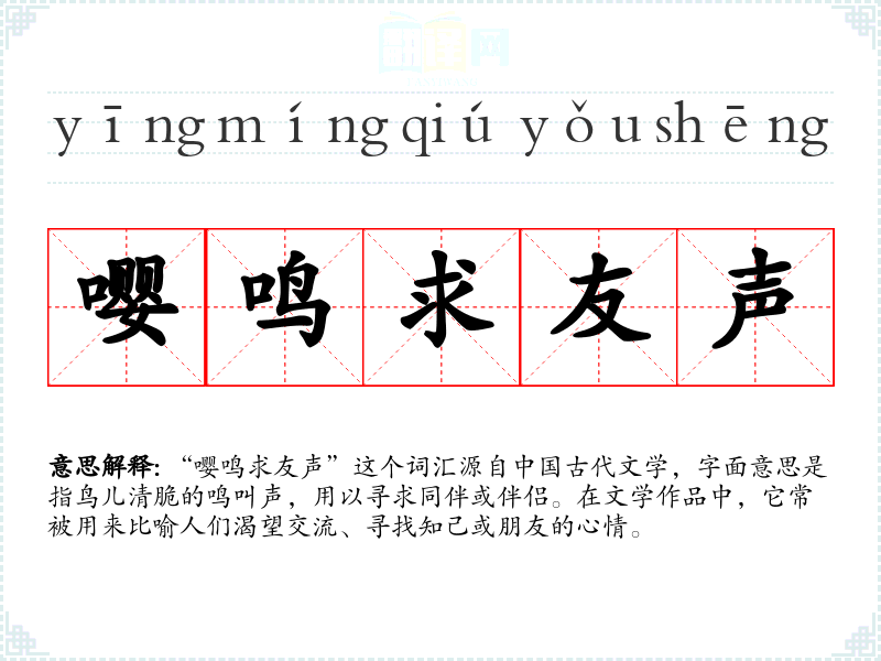 “嘤鸣求友声”这个词汇源自**古代文学,字面意思是指鸟儿清脆的鸣叫声,用以寻求同伴或伴侣。在文学作品中,它常被用来比喻人们渴望交流、寻找知己或朋友的心情。