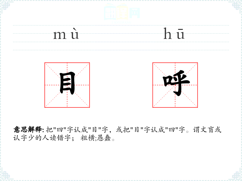 把"四"字认成"目"字,或把"目"字认成"四"字。谓文盲或认字少的人读错字; 粗横;愚蠢。