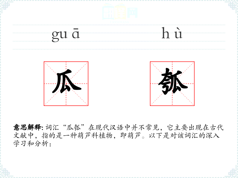 词汇“瓜瓠”在现代汉语中并不常见,它主要出现在古代文献中,指的是一种葫芦科植物,即葫芦。以下是对该词汇的深入学*和分析: