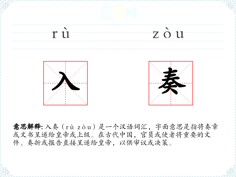 入奏(rù zòu)是一个汉语词汇,字面意思是指将奏章或文书呈递给或上级。在古代,官员或使者将重要的文件、奏折或报告直接呈递给**,以供审议或决策。