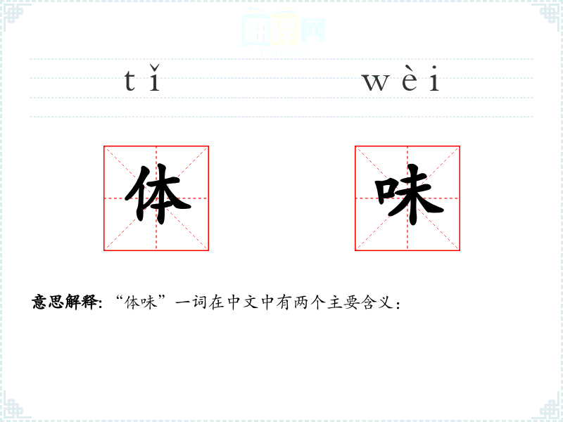 "体味"的意思解释、体味是什么意思由翻译网汉语词典查词提供。