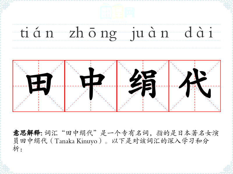 词汇“田中绢代”是一个专有名词,指的是日本著名女演员田中绢代(Tanaka Kinuyo)。以下是对该词汇的深入学习和分析: