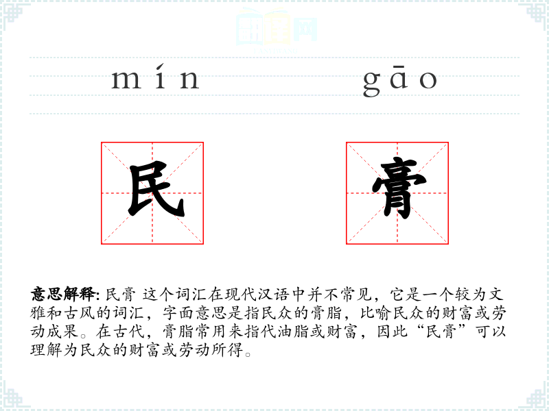 “民膏”这个词汇虽然不常用于现代口语,但它承载了丰富的历史文化信息,对于理解古代社会经济结构和民众生活状态具有重要意义。在学*汉语和了解**历史文化时,这个词汇提供了一个独特的视角。