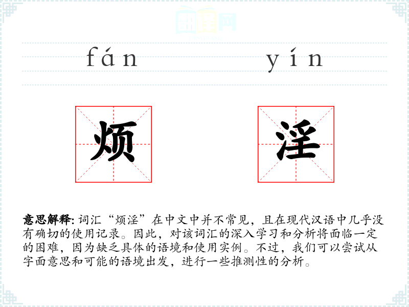 词汇“烦淫”在中文中并不常见,且在现代汉语中几乎没有确切的使用记录。因此,对该词汇的深入学习和分析将面临一定的困难,因为缺乏具体的语境和使用实例。不过,我们可以尝试从字面意思和可能的语境出发,进行一些推测性的分析。