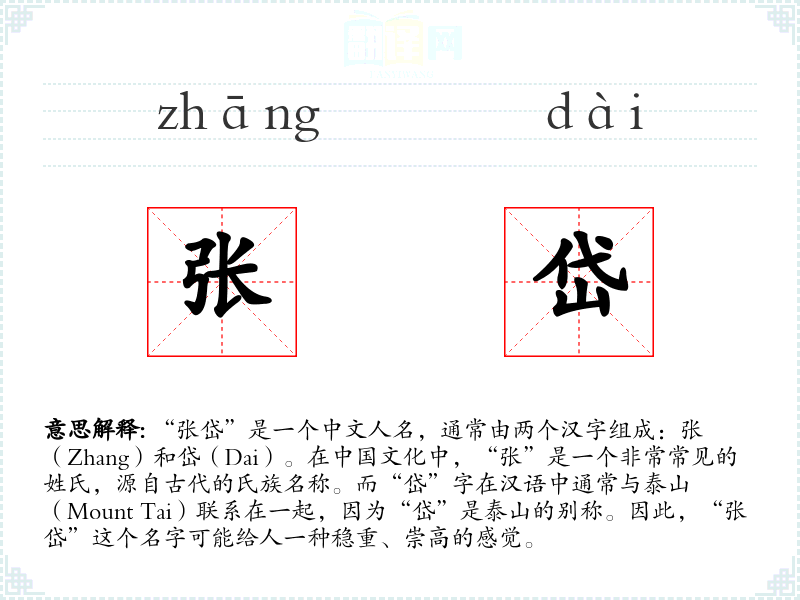 “张岱”是一个中文人名,通常由两个汉字组成:张(Zhang)和岱(Dai)。在**文化中,“张”是一个非常常见的姓氏,源自古代的氏族名称。而“岱”字在汉语中通常与泰山(Mount Tai)联系在一起,因为“岱”是泰山的别称。因此,“张岱”这个名字可能给人一种稳重、崇高的感觉。