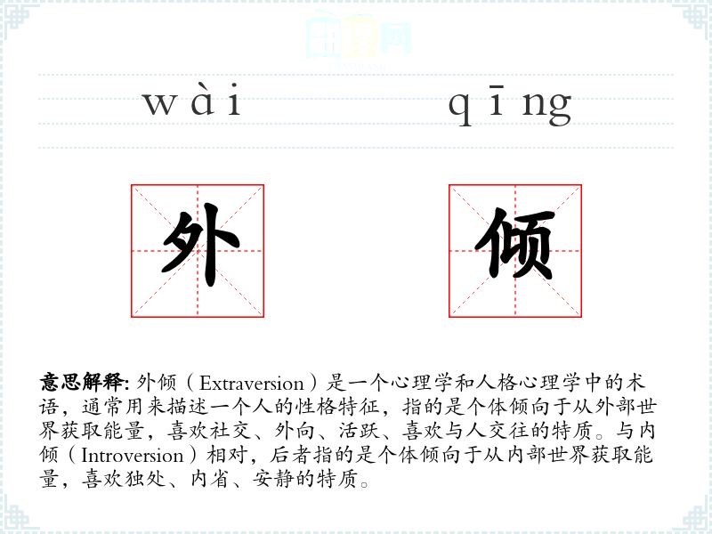 外倾(Extraversion)是一个心理学和人格心理学中的术语,通常用来描述一个人的性格特征,指的是个体倾向于从外部世界获取能量,喜欢社交、外向、活跃、喜欢与人交往的特质。与内倾(Introversion)相对,后者指的是个体倾向于从内部世界获取能量,喜欢独处、内省、安静的特质。
