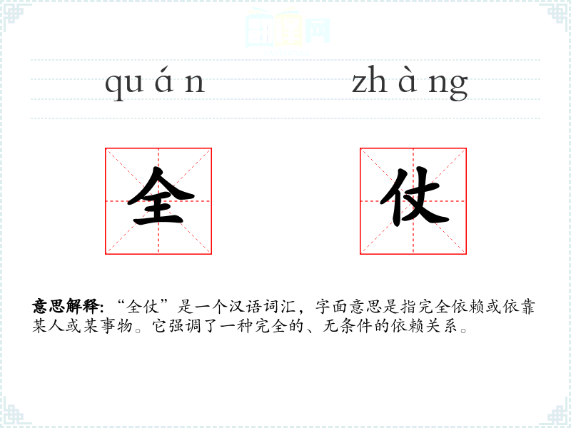 “全仗”是一个汉语词汇,字面意思是指完全依赖或依靠某人或某事物。它强调了一种完全的、无条件的依赖关系。