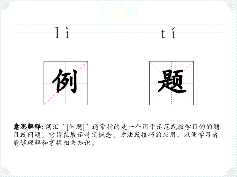 - 反义词:无(因为“例题”是一个特定的教学工具,没有直接的反义词)
