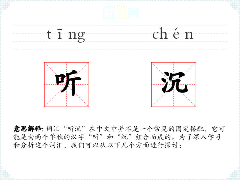 词汇“听沉”在中文中并不是一个常见的固定搭配,它可能是由两个单独的汉字“听”和“沉”组合而成的。为了深入学习和分析这个词汇,我们可以从以下几个方面进行探讨: