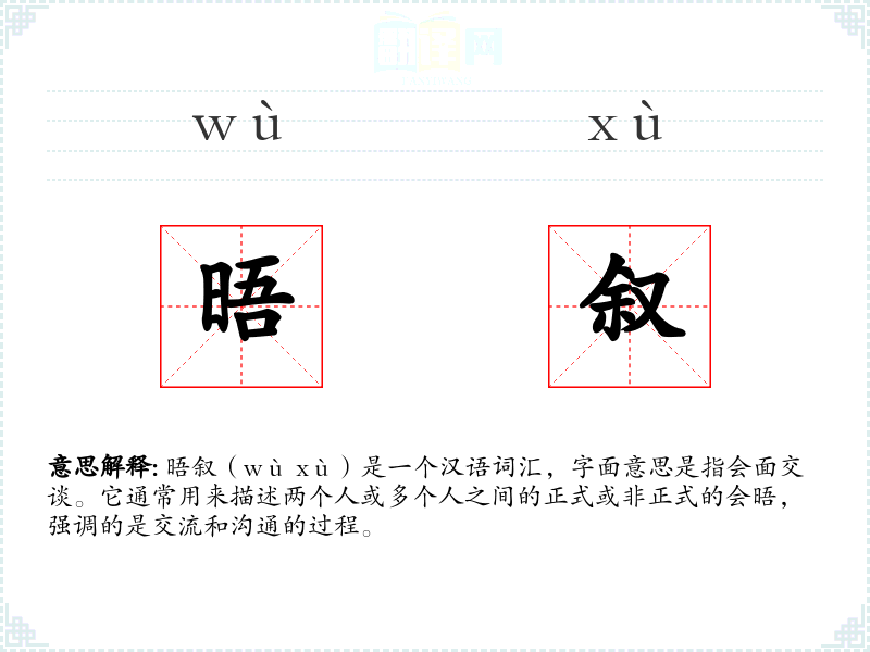 晤叙(wù xù)是一个汉语词汇,字面意思是指会面交谈。它通常用来描述两个人或多个人之间的正式或非正式的会晤,强调的是交流和沟通的过程。