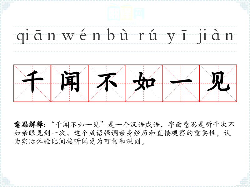 “千闻不如一见”是一个汉语成语,字面意思是听千次不如亲眼见到一次。这个成语强调亲身经历和直接观察的重要性,认为实际体验比间接听闻更为可靠和深刻。