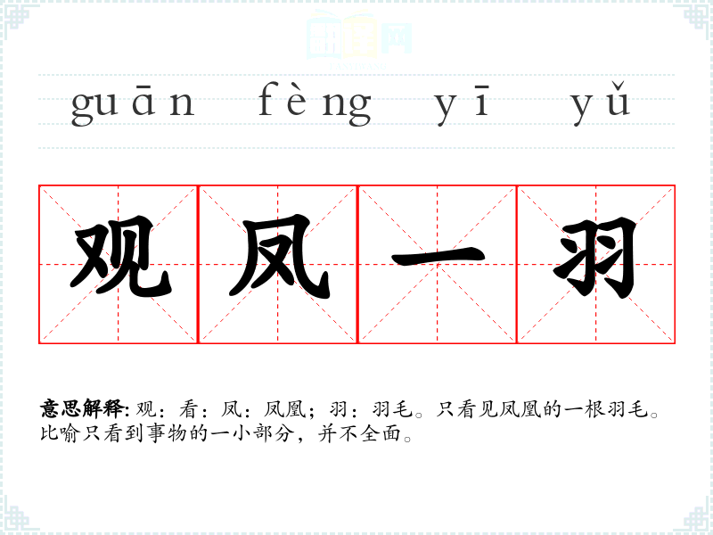 观:看:凤:凤凰;羽:羽毛。只看见凤凰的一根羽毛。比喻只看到事物的一小部分,并不全面。
