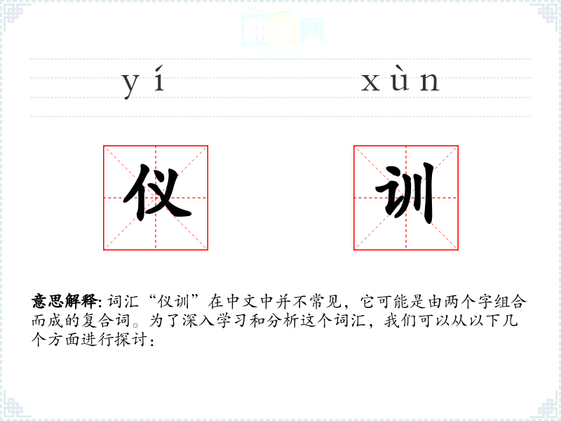 词汇“仪训”在中文中并不常见,它可能是由两个字组合而成的复合词。为了深入学*和分析这个词汇,我们可以从以下几个方面进行探讨: