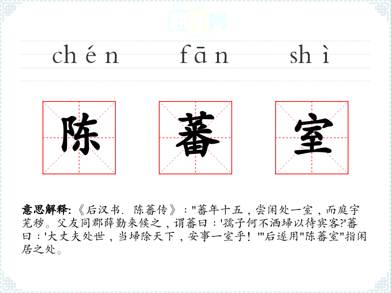 《后汉书.陈蕃传》﹕"蕃年十五﹐尝闲处一室﹐而庭宇芜秽。父友同郡薛勤来候之﹐谓蕃曰﹕'孺子何不洒埽以待宾客?'蕃曰﹕'大丈夫处世﹐当埽除天下﹐安事一室乎!'"后遂用"陈蕃室"指闲居之处。