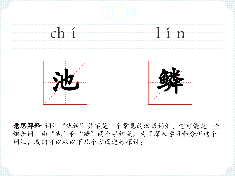 词汇“池鳞”并不是一个常见的汉语词汇,它可能是一个组合词,由“池”和“鳞”两个字组成。为了深入学*和分析这个词汇,我们可以从以下几个方面进行探讨: