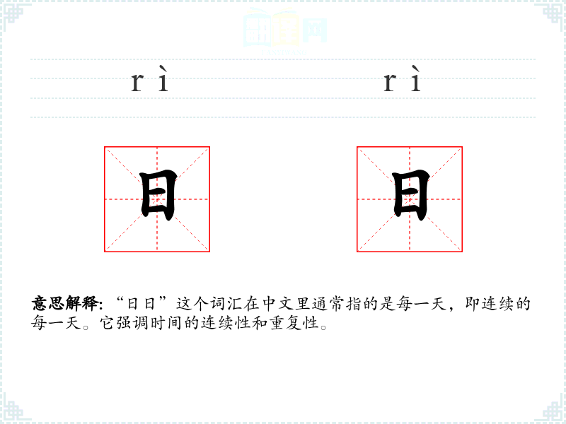 “日日”由两个相同的“日”字组成,这种重复结构在中文中常见,用以强调连续性和重复性。在古代汉语中,“日日”就已经存在,且用法与现代汉语相似。