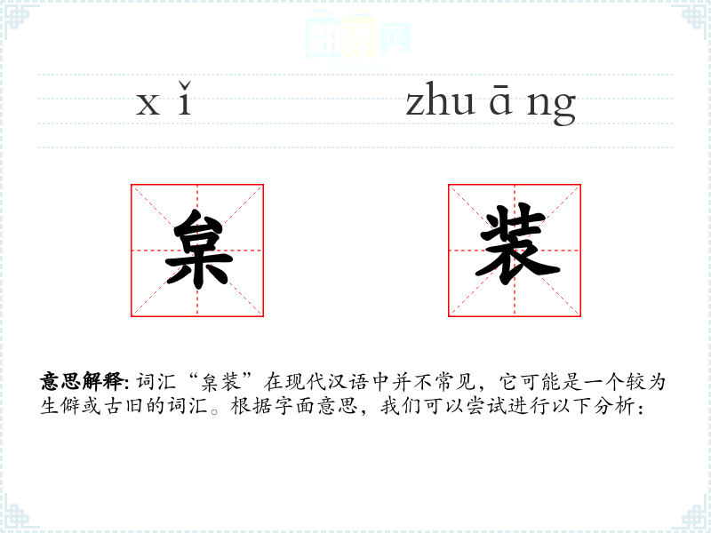 词汇“枲装”在现代汉语中并不常见,它可能是一个较为生僻或古旧的词汇。根据字面意思,我们可以尝试进行以下分析: