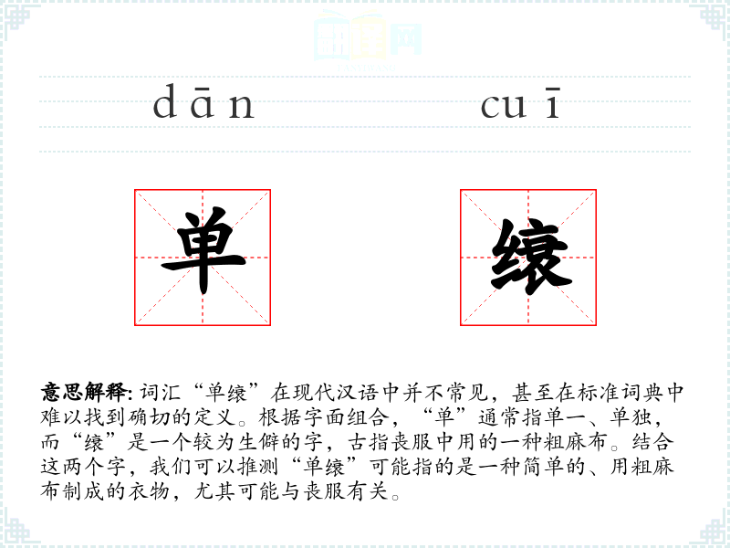 词汇“单缞”在现代汉语中并不常见,甚至在标准词典中难以找到确切的定义。根据字面组合,“单”通常指单一、单独,而“缞”是一个较为生僻的字,古指丧服中用的一种粗麻布。结合这两个字,我们可以推测“单缞”可能指的是一种简单的、用粗麻布制成的衣物,尤其可能与丧服有关。