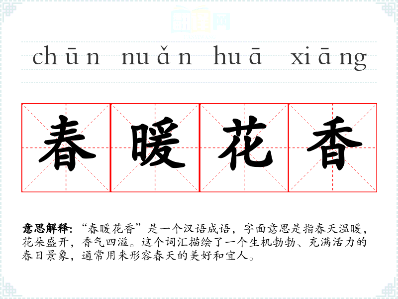 “春暖花香”是一个汉语成语,字面意思是指春天温暖,花朵盛开,香气四溢。这个词汇描绘了一个生机勃勃、充满活力的春日景象,通常用来形容春天的美好和宜人。