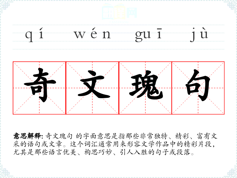奇文瑰句 的字面意思是指那些非常独特、精彩、富有文采的语句或文章。这个词汇通常用来形容文学作品中的精彩片段,尤其是那些语言优美、构思巧妙、引人入胜的句子或段落。