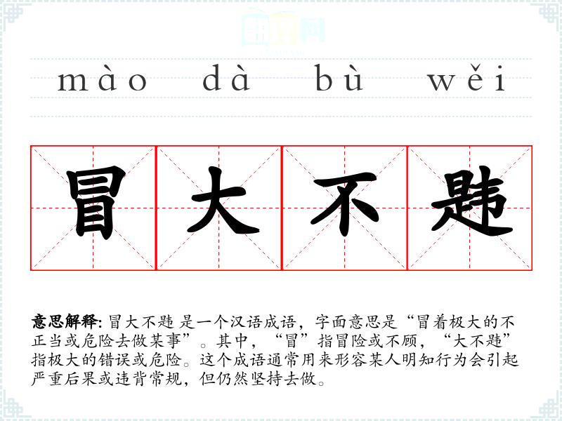 冒大不韪 是一个汉语成语,字面意思是“冒着极大的不正当或危险去做某事”。其中,“冒”指冒险或不顾,“大不韪”指极大的错误或危险。这个成语通常用来形容某人明知行为会引起严重后果或违背常规,但仍然坚持去做。