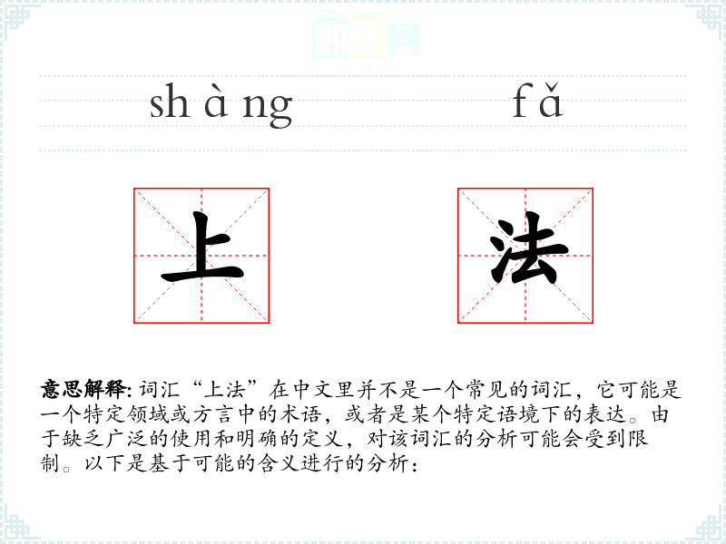 词汇“上法”在中文里并不是一个常见的词汇,它可能是一个特定领域或方言中的术语,或者是某个特定语境下的表达。由于缺乏广泛的使用和明确的定义,对该词汇的分析可能会受到限制。以下是基于可能的含义进行的分析: