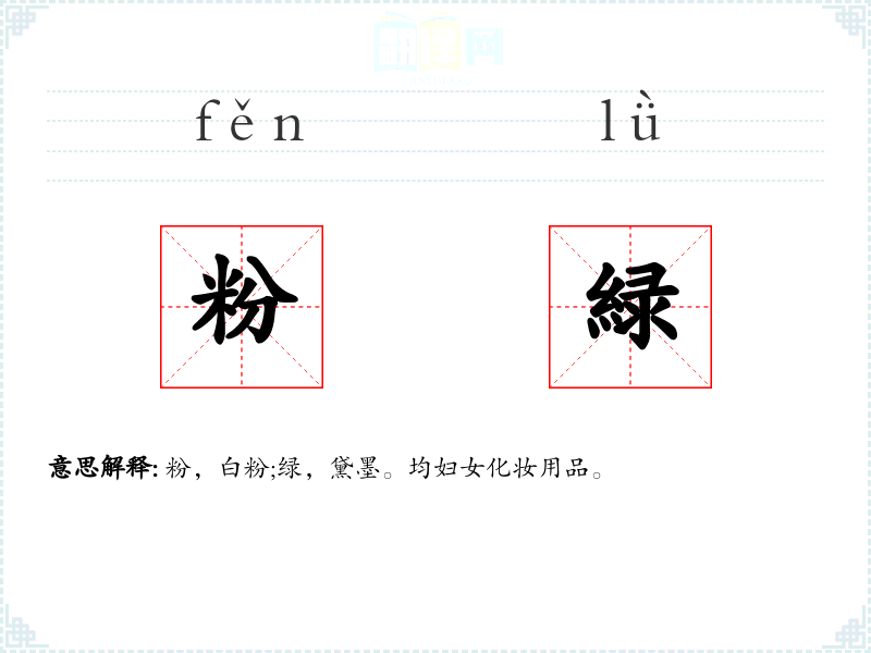 粉,白粉;绿,黛墨。均妇女化妆用品。