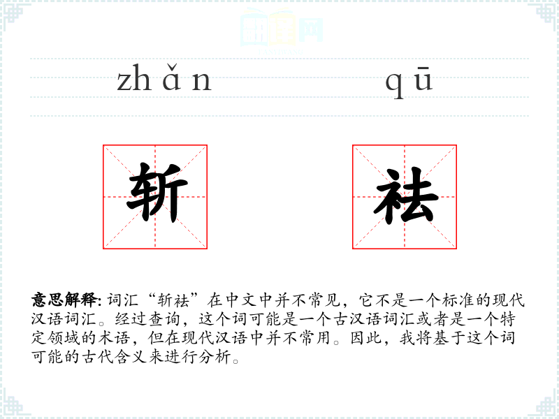 词汇“斩袪”在中文中并不常见,它不是一个标准的现代汉语词汇。经过查询,这个词可能是一个古汉语词汇或者是一个特定领域的术语,但在现代汉语中并不常用。因此,我将基于这个词可能的古代含义来进行分析。
