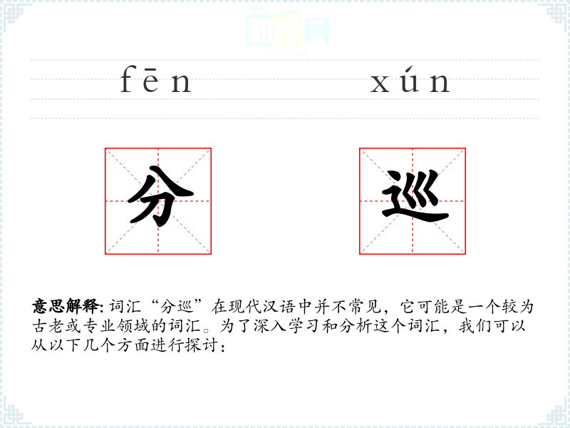 词汇“分巡”在现代汉语中并不常见,它可能是一个较为古老或专业领域的词汇。为了深入学*和分析这个词汇,我们可以从以下几个方面进行探讨: