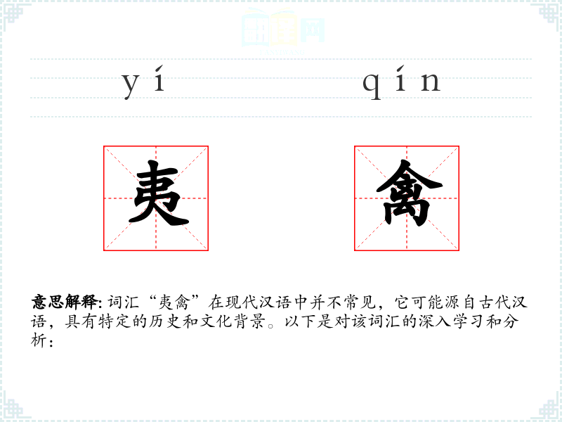 词汇“夷禽”在现代汉语中并不常见,它可能源自古代汉语,具有特定的历史和文化背景。以下是对该词汇的深入学*和分析: