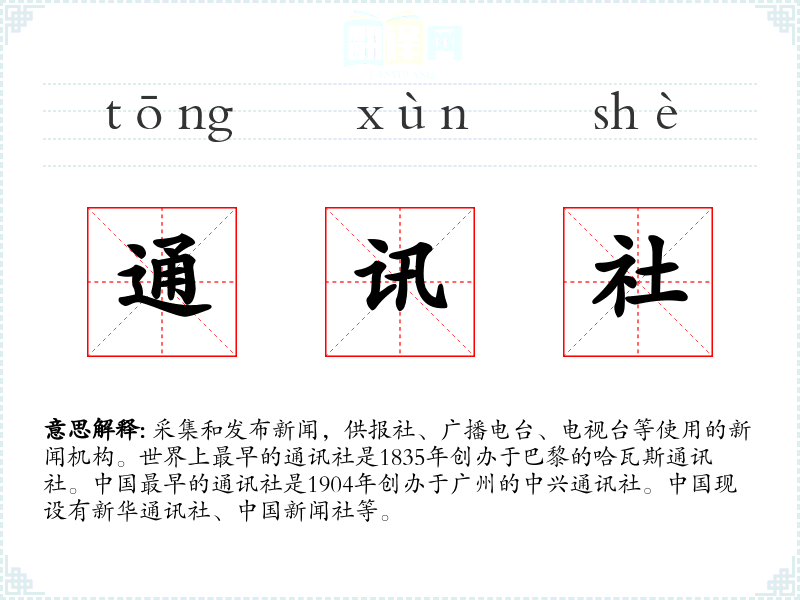 1.采集和发布新闻,供报社、广播电台、电视台等使用的新闻机构。世界上最早的通讯社是1835年创办于巴黎的哈瓦斯通讯社。中国最早的通讯社是1904年创办于广州的中兴通讯社。中国现设有新华通讯社、中国新闻社等。