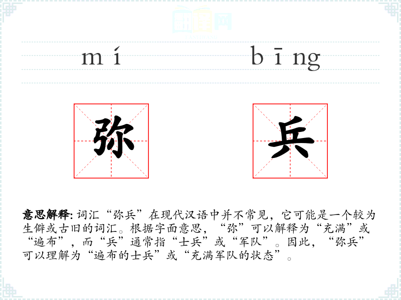 词汇“弥兵”在现代汉语中并不常见,它可能是一个较为生僻或古旧的词汇。根据字面意思,“弥”可以解释为“充满”或“遍布”,而“兵”通常指“士兵”或“军队”。因此,“弥兵”可以理解为“遍布的士兵”或“充满军队的状态”。